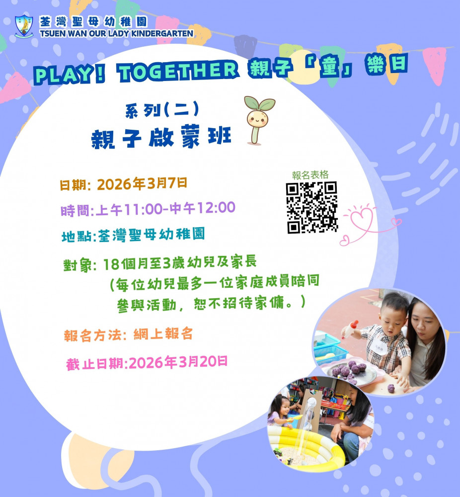 ??本園將於2026年3月7日(星期六)起舉辦Play! Together 親子「童」樂日系列(二) 之 親子啟蒙班,此活動共有5課,讓幼兒及家長能親臨幼稚園,與老師透過每堂多元化的遊戲及主題活動,提升學習的興趣,幫助幼兒逐步適應團體生活。